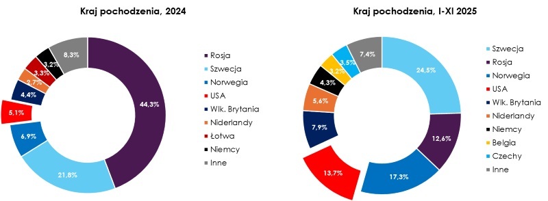 Po 11 miesiącach 2025 r. udział gazu rosyjskiego w strukturze importu LPG do Polski wynosił niespełna 13%. Największym dostawcą pozostaje Szwecja z udziałem ok. 25% przed Norwegią (17%) i Stanami Zjednoczonymi (14%), które w ciągu minionego roku awansowały na trzecie miejsce. W tym samym okresie terminale morskie przejęły dominującą rolę w zaopatrzeniu rynku krajowego, zastępując dostawy kolejowe. Ich udział w imporcie gazu płynnego do Polski wzrósł z 29% w 2024 r. do 57% w 2025 r. W ciągu roku Polska odwróciła się od wschodu i zwróciła ku Bałtykowi.